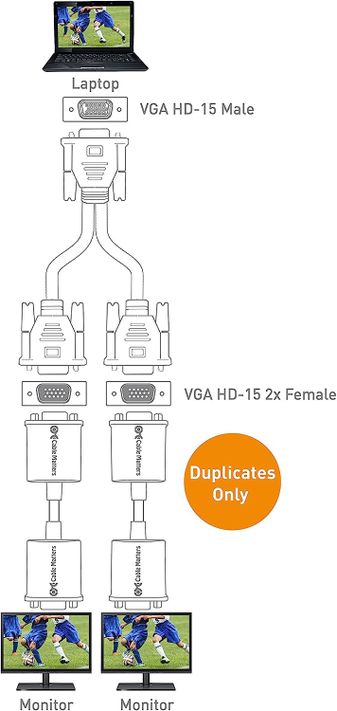 -The VGA splitter Cable has a male connector that plugs directly into a computer; 2 VGA female connectors will lead out of the computer and will require additional VGA cables (not included) plugged into separate monitors to display.