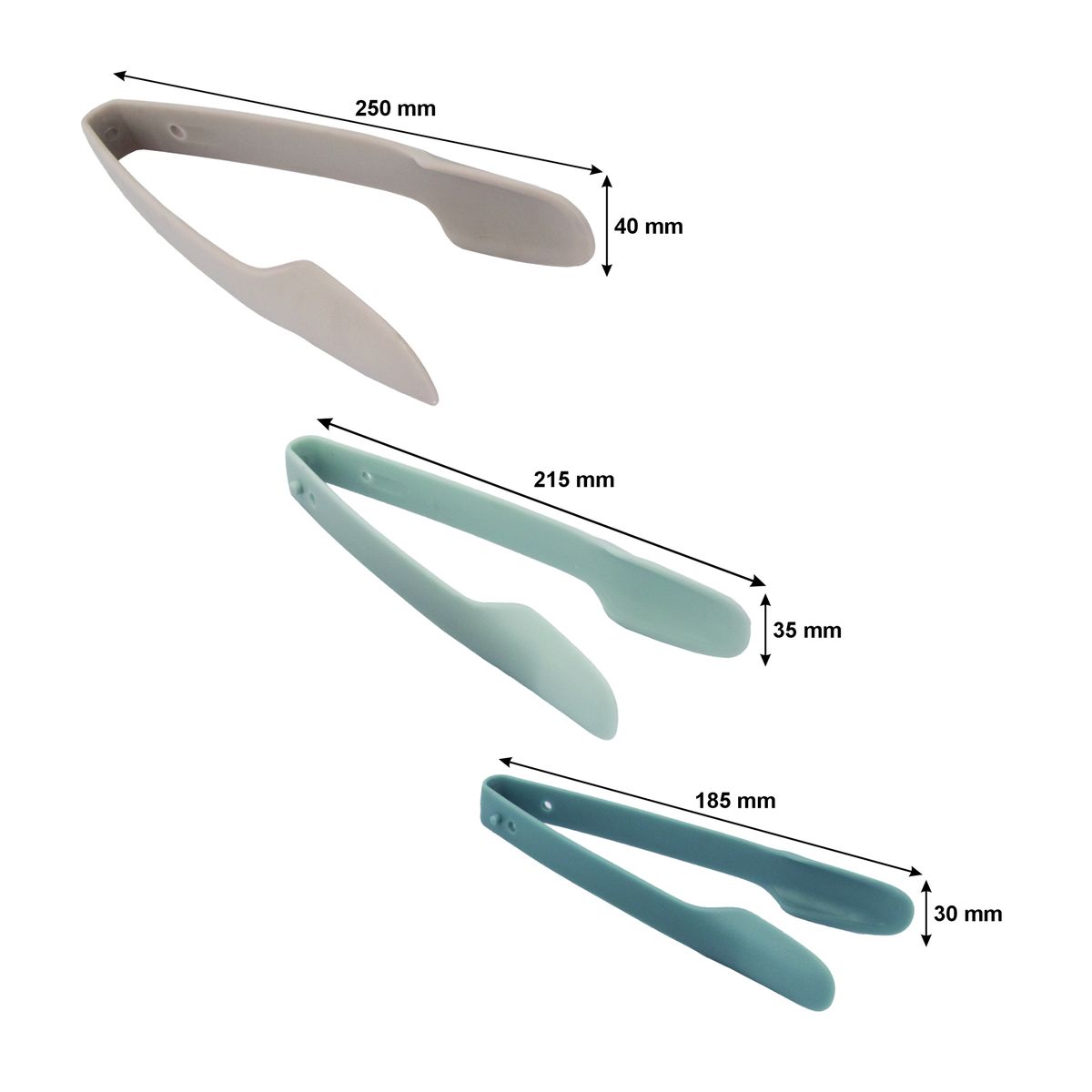 This set consists of 3 plastic tongs each of different pastel colour and length Taupe (25cm), Light Blue (21.5cm) and Dark Blue (18.5cm).