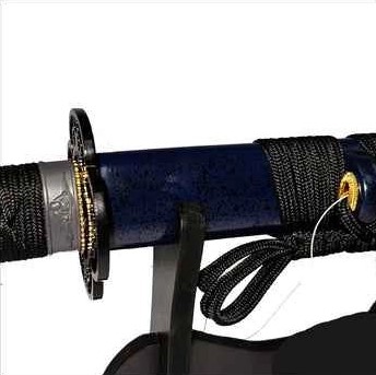 This beautifully crafted, non-stainless steel katana featuring a sleek, dark blue sheath. The blade offers strength, durability, and sharpness compared to stainless steel. The blade has a traditional, polished finish with a subtle curve, ideal for collectors or martial artists seeking authenticity and functionality. The dark blue saya (sheath) is made from high-quality lacquered wood, giving it a deep, glossy appearance. The handle is wrapped in black cord for a comfortable and secure grip. This katana is perfect for enthusiasts of traditional Japanese swords looking for a unique and well-made piece.