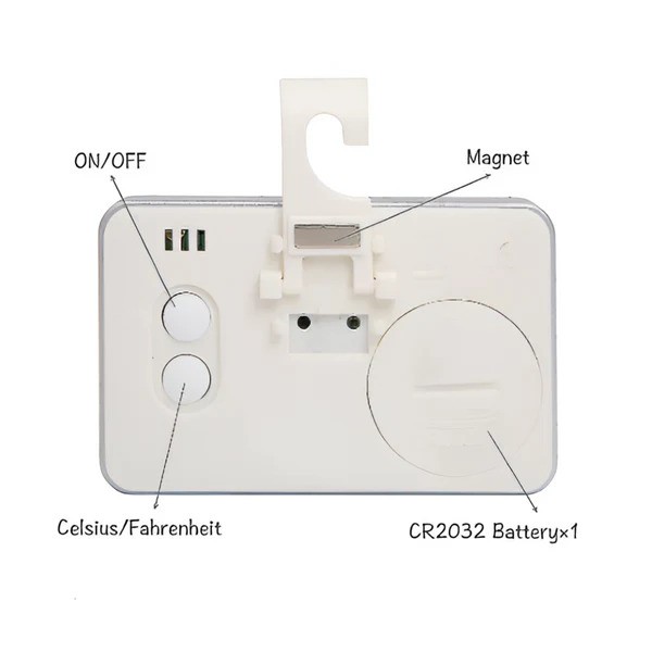 -You have 3 different choices for placement for the room thermometer. Either stick it to the refrigerator door with the rear magnet, or use the stand to place it on the table-top, and finally you can flip the stand over and use the hook to hang it on a refrigerator shelf.