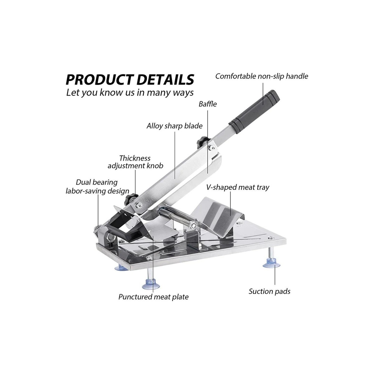 This meat slicer is a must have kitchen tool designed for slicing frozen meats with ease and precision. It is constructed from durable stainless steel, ensuring longevity and resistance to corrosion. With adjustable blades, cut your meat to your preferred thickness, or for recipe requirements. Suction grips or suction cups at the base secure the slicer to the countertop or table surface, providing stability during use.