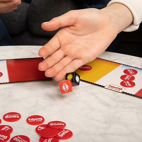 -Take Take Boom is an explosively fun family dice game. Risk it all by taking turns betting and rolling the dice to see how much you win, or how much you lose.