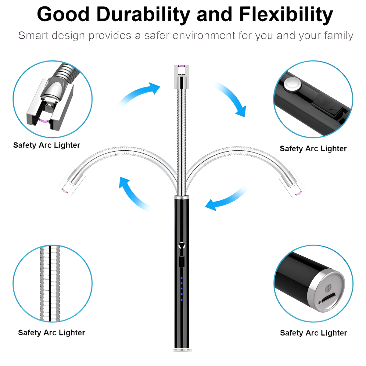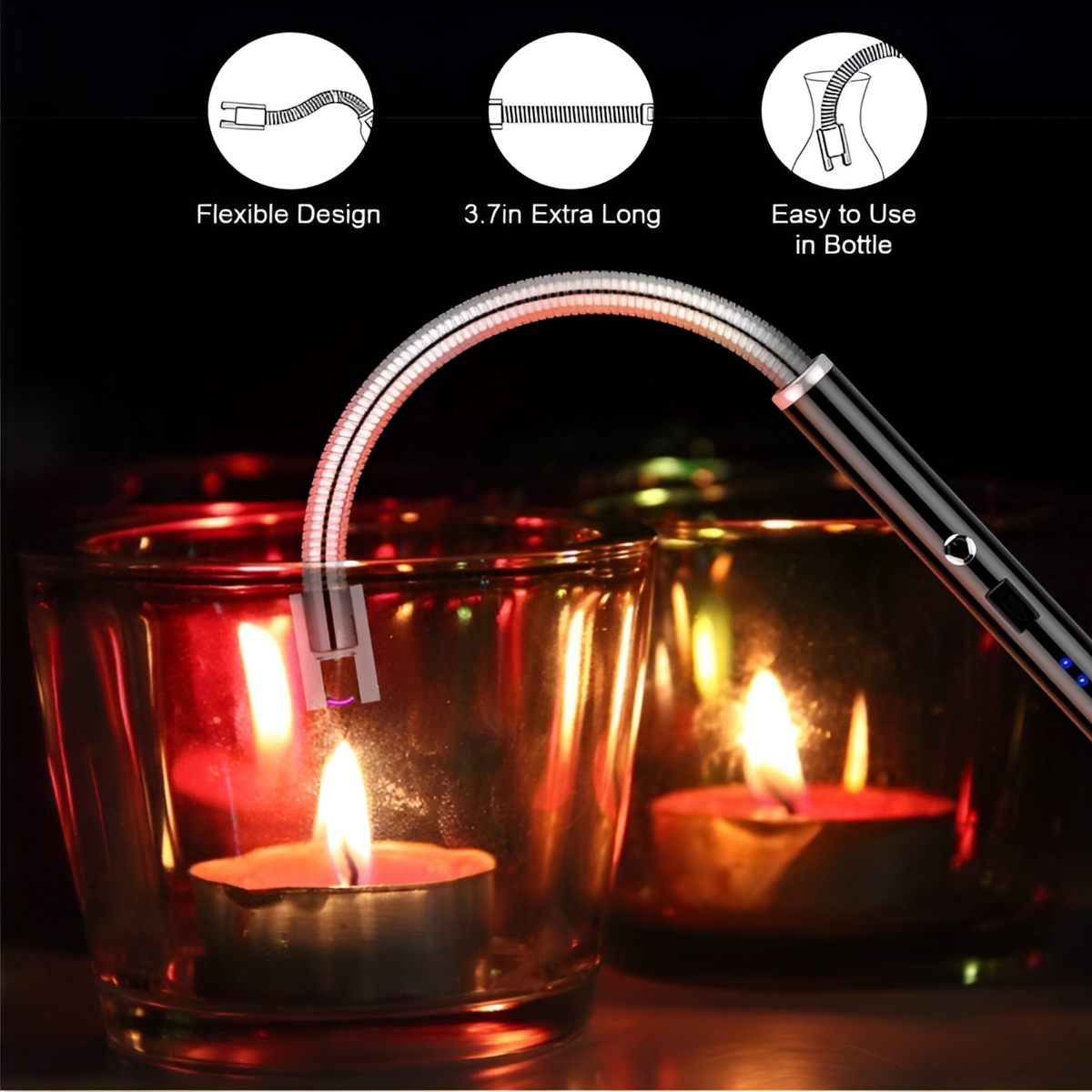 Our electric long matches for candles has a flexible neck (10cm or about 4 inches). It can easily rotate 360 degrees for different lighting needs. Lightweight size is suitable for daily indoor and outdoor use.